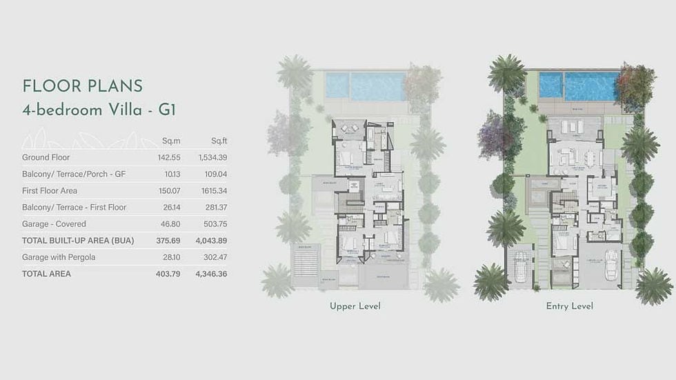This villa is the epitome of luxurious and modern living, with a design that embodies the opulence of Dubai style. With a total area of 403.79 square meters, the 4-bedroom Villa-G1 features every essential component of a contemporary minimalist home. The different spaces in the villa are clearly distinguished by a monochromatic color palette – white for the bedrooms and kitchens, grey for the living room, and white for the corridor, staircase, and large window frame.