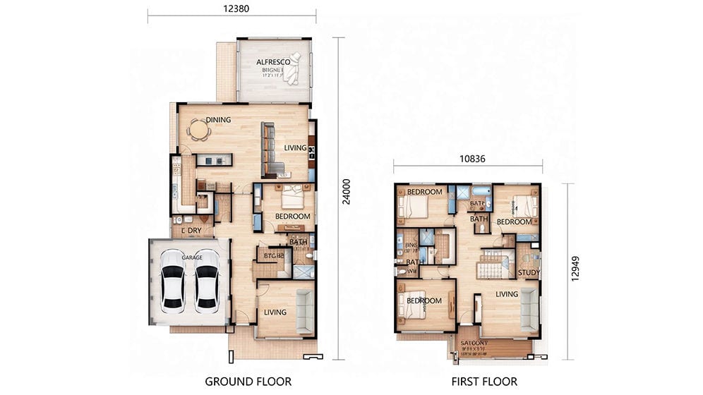 - Bathrooms: Three modern bathrooms with premium fittings enhance convenience and luxury. Garages: Two-car garages provide secure parking and ample storage space.