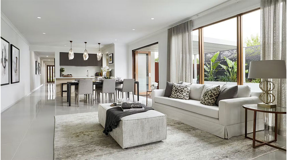The home opens up into a bright and spacious open-plan area. Here, the living room, dining space, and kitchen flow seamlessly together, creating a natural hub for family life and entertaining. The modern open kitchen easily becomes the focal point of this shared zone.