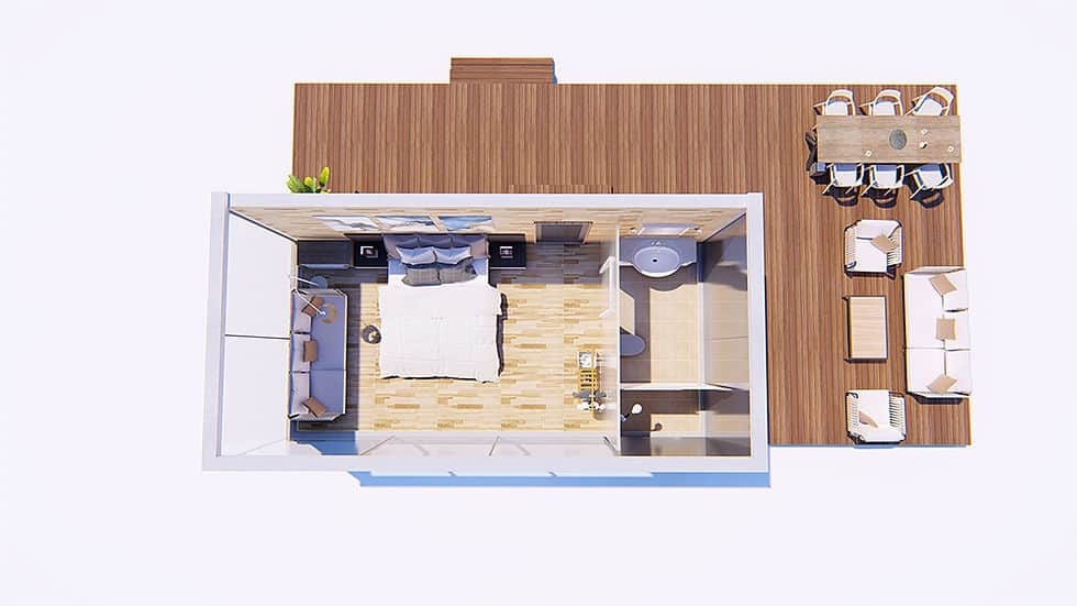 This compact yet versatile cabin is thoughtfully designed to maximize comfort and functionality within its 25㎡ layout, featuring a cozy living area, a compact kitchen, a bathroom, and a comfortable bedroom. These spaces are optimized for relaxation, offering all essential amenities within a beautifully streamlined environment.