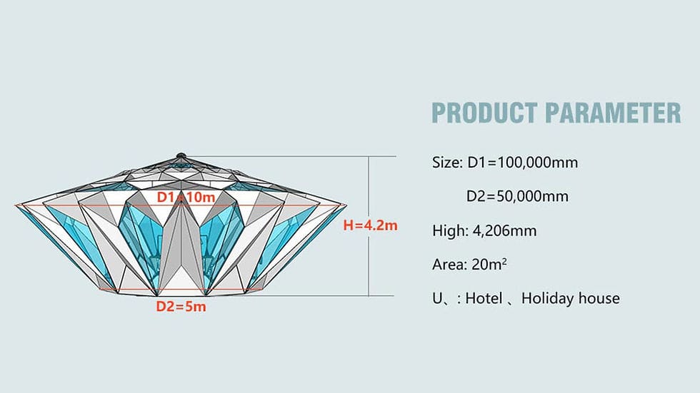 Snow Lotus has a diameter of 5 meters and features a comfortable bed, a bathroom, and a cozy living room for relaxation. The house is designed to provide a unique and personalized experience to its occupants. The color and design of the dome house can be customized to suit your preferences, adding a touch of architectural elegance to your space.