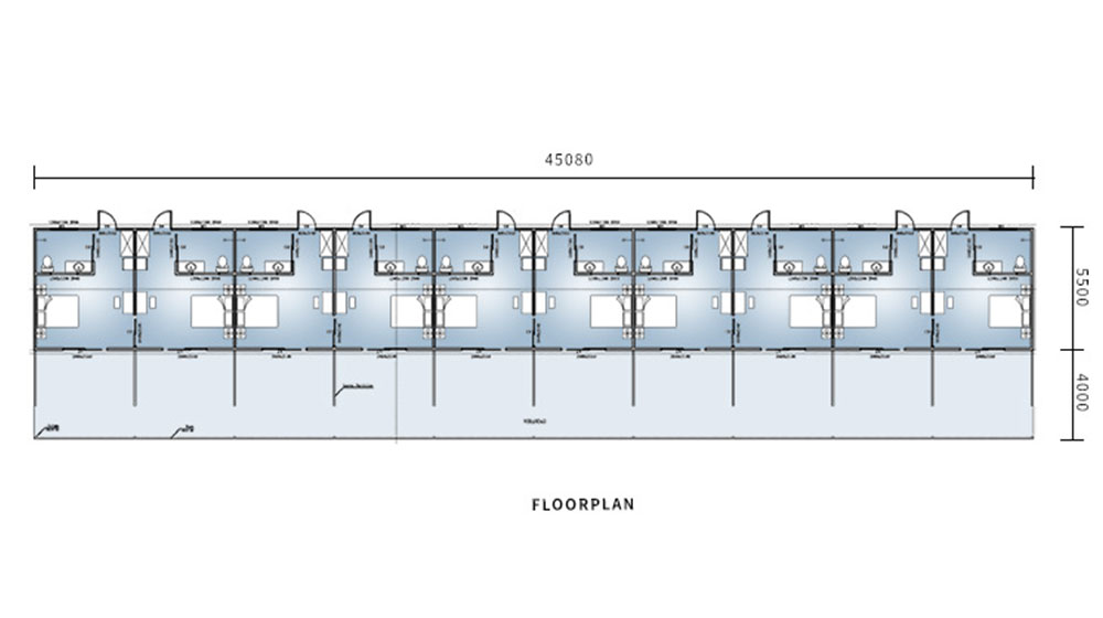 This efficiently designed motel structure stretches 45 meters in length with a 5.5-meter width, creating approximately 250 square meters of functional space. The layout features ten self-contained standard rooms, each providing a comfortable bedroom and a private bathroom to fully meet hotel accommodation requirements.