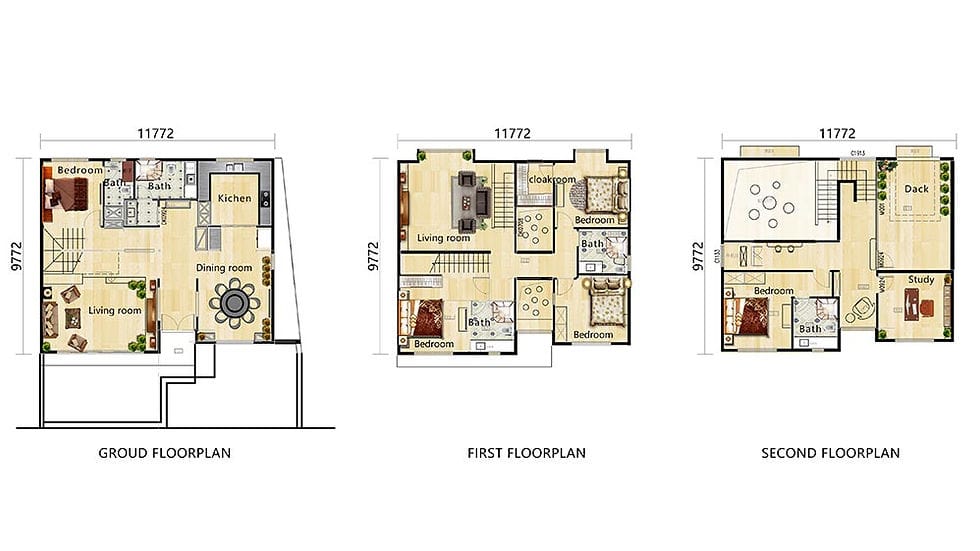 The first floor features a spacious living room and an open kitchen, which is designed for the convenience of the elderly. The second floor offers a living room and three rooms, while the third floor has a beautiful and cozy room. The entire villa is designed to provide a comfortable and luxurious living experience for all its residents.