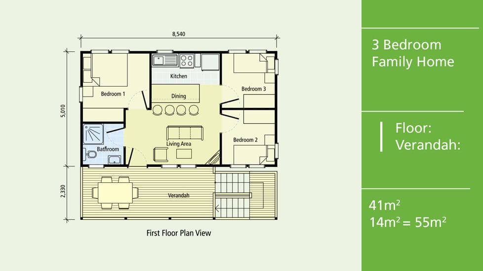 The DP-B-12 bungalow has a length of 8540mm and a width of 5010mm, providing a total area of 41 square meters. The verandah is also spacious, with a total area of 14 square meters. This bungalow is perfect for families who want a comfortable and functional living space that is also affordable.